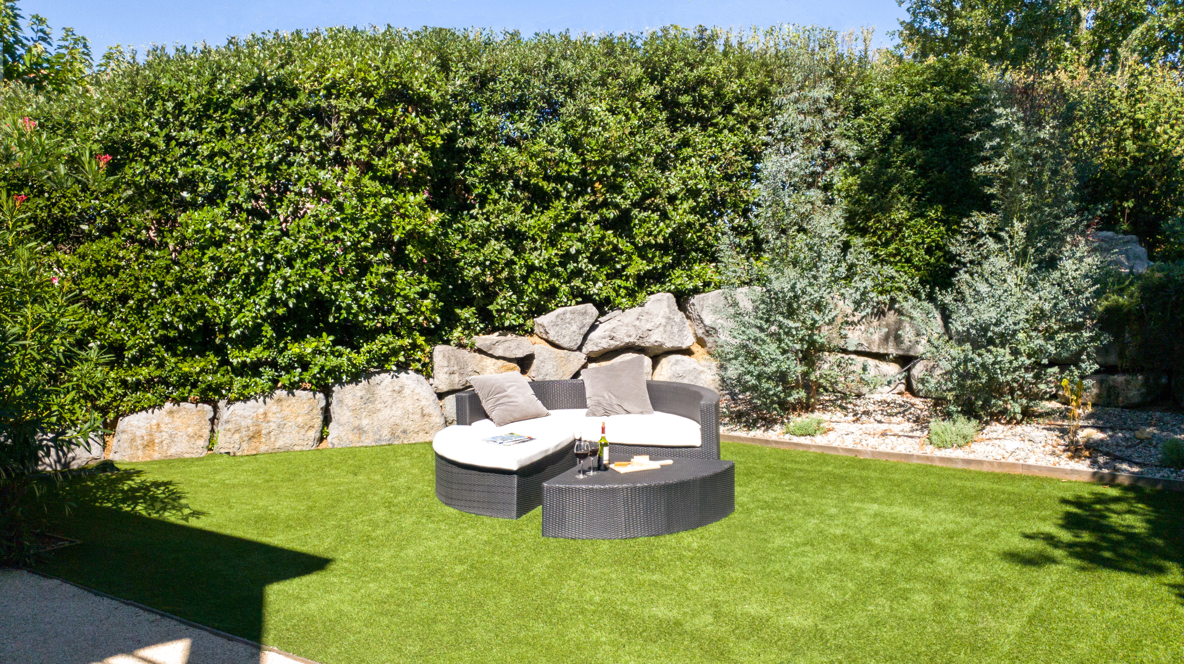 Terras achter de villa, u kunt hier in de zon zitten op het hoger gelegen deel of in de koelte van de schaduw onder de eikenboom.